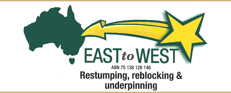 Read about the Reblocking Process here! East to West is Melbourne's professional reblocking, restumping and underpinning company We are dedicated to serving Melbourne's residents with our expertise and commitment to providing the highest quality service. We have been a proud member of the industry for over 15 years. We serve all area's of Melbourne, Greater Melbourne and Victoria. We pride ourselves on our experience and professionalism in completing our jobs on time and within budget. We provide great value and a 7 year guarantee on our work. Read more about us and our history in the reblocking industry here. |